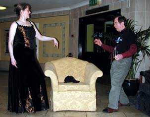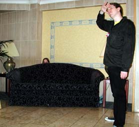 earlier in the day gets the idea of hiding behind the sofa.